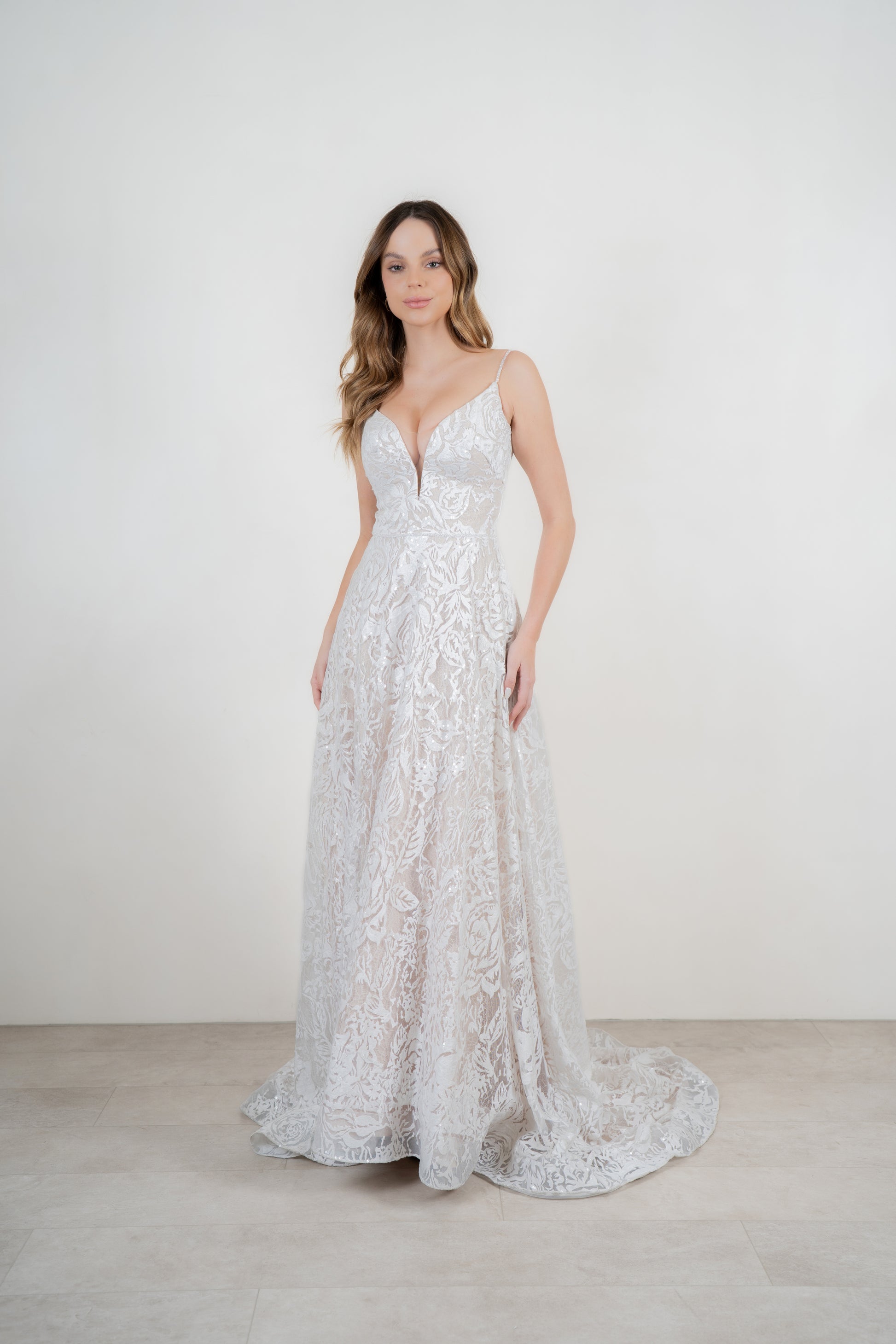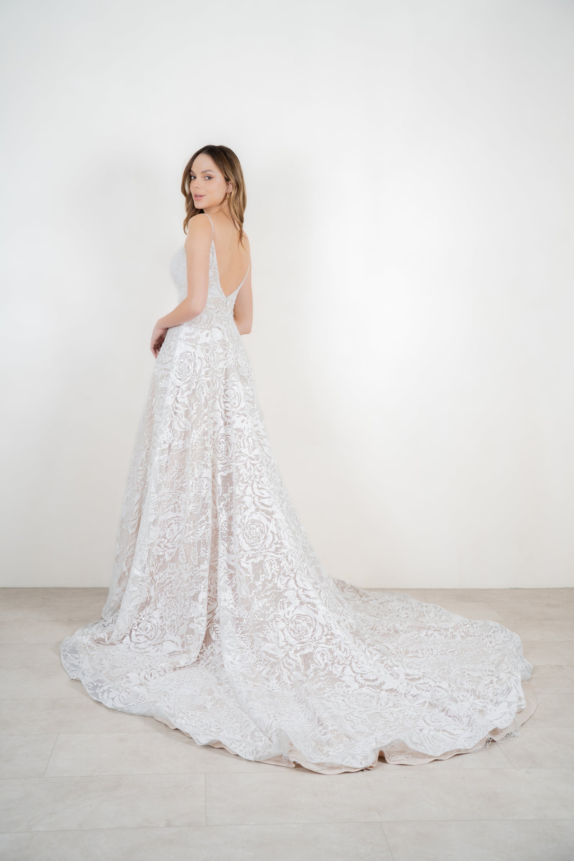 La personalidad magestuosa de este diseño lo hacen imperioso. Un manto de bordados cae sobre una base en tono piel, que genera el contraste perfecto de texturas. Un escote prominente se proyecta hacia la cintura desde donde nace un faldon de ruedo amplio, imponente, perfecto para deslumbrar en los atardeceres del mediterráneo.