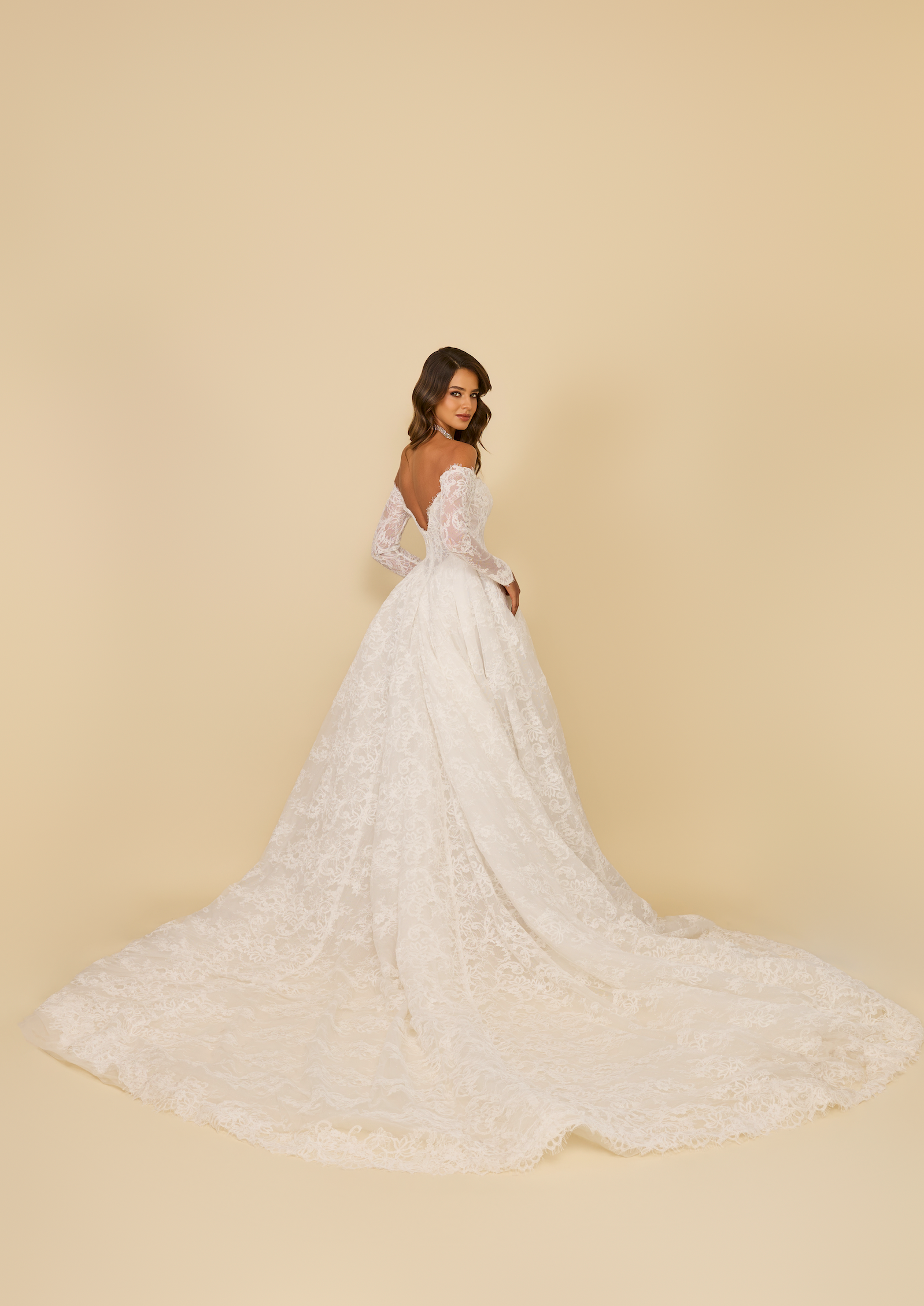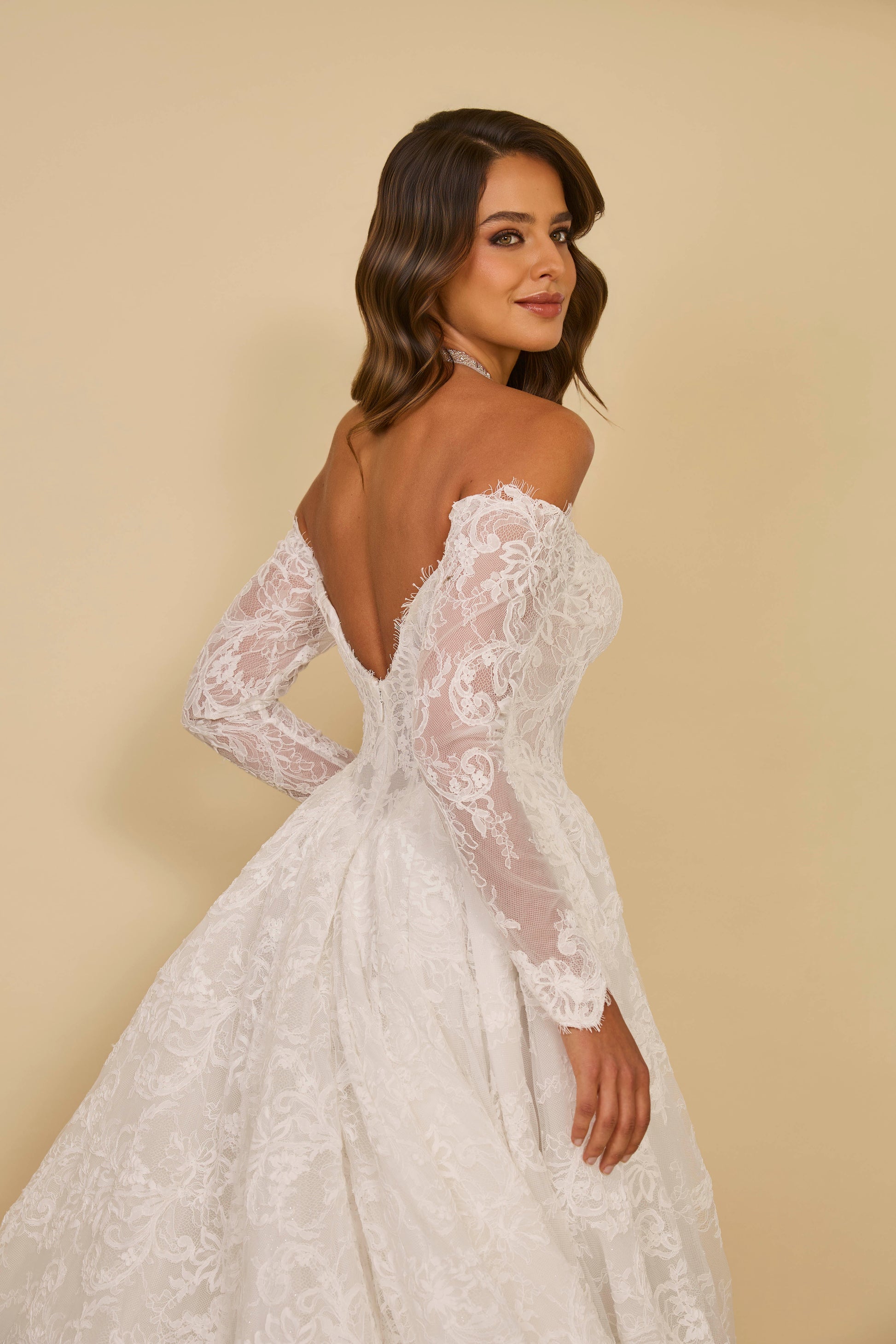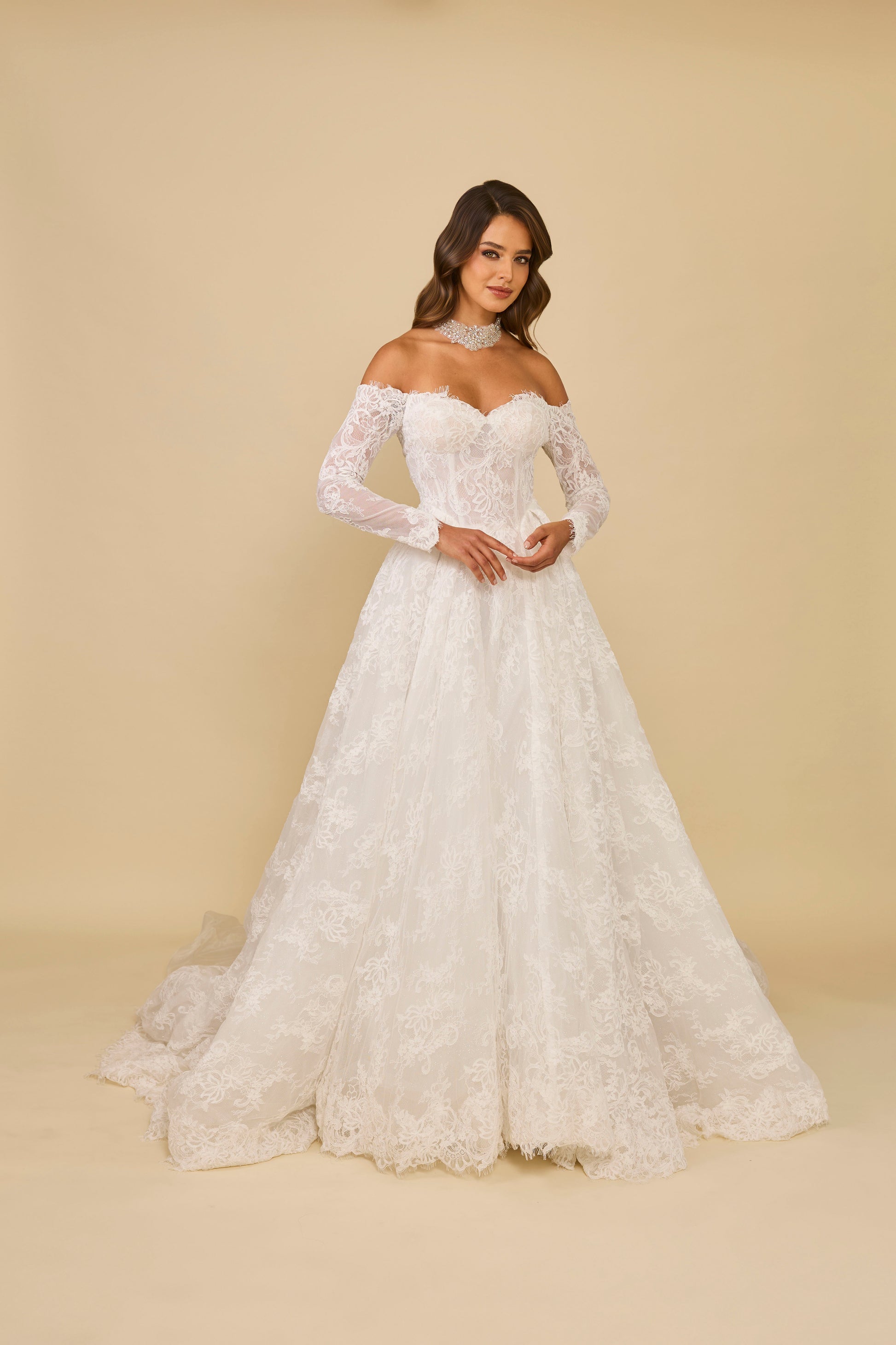 Vestido corte tipo princesa y corsette overback con escote semi corazón delantero, recto en espalda y mangas offshoulders. Confeccionado en encaje Francés y aplicaciones bordadas color Ivory sobre una base de microseda, tull y crin para dar volumen.