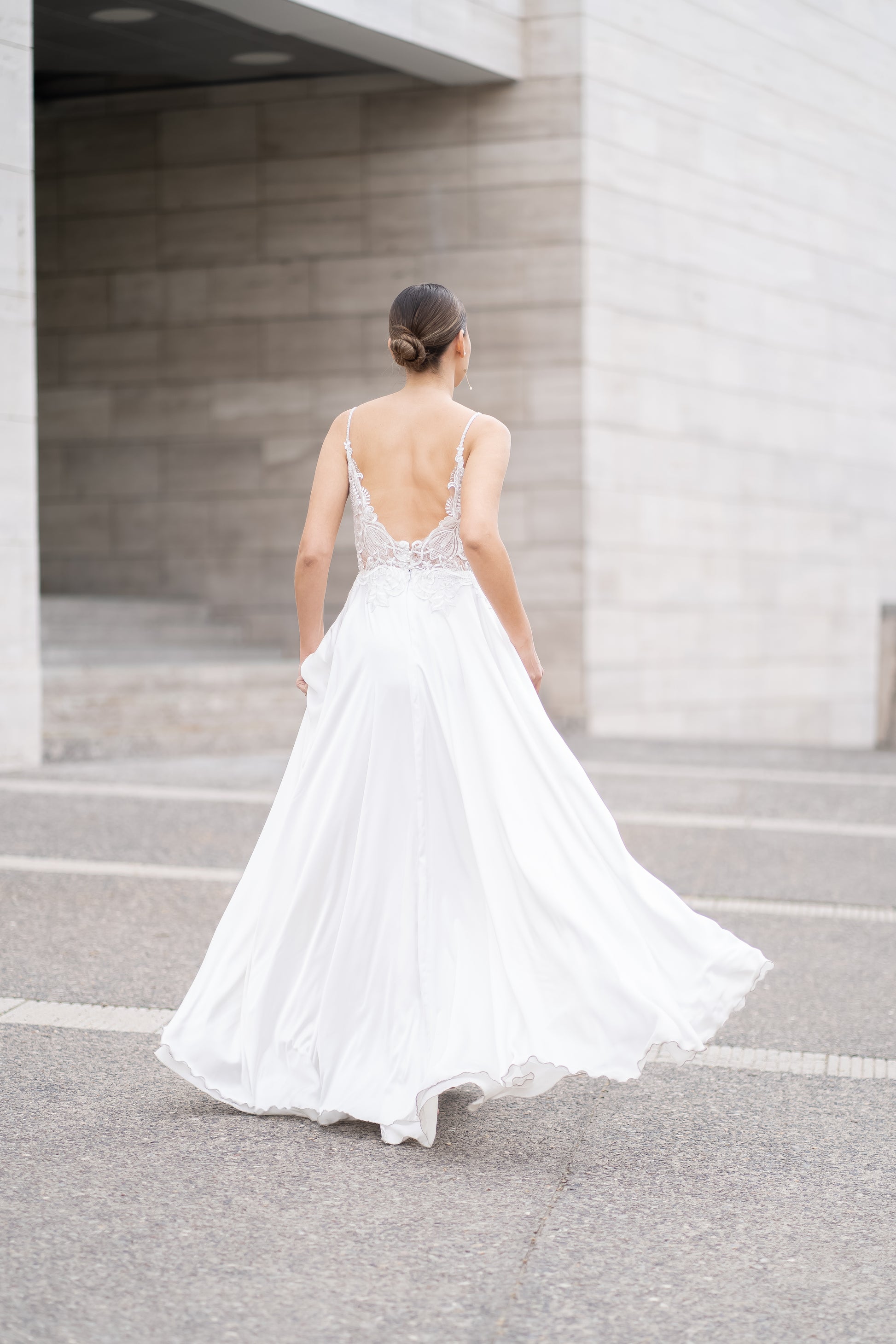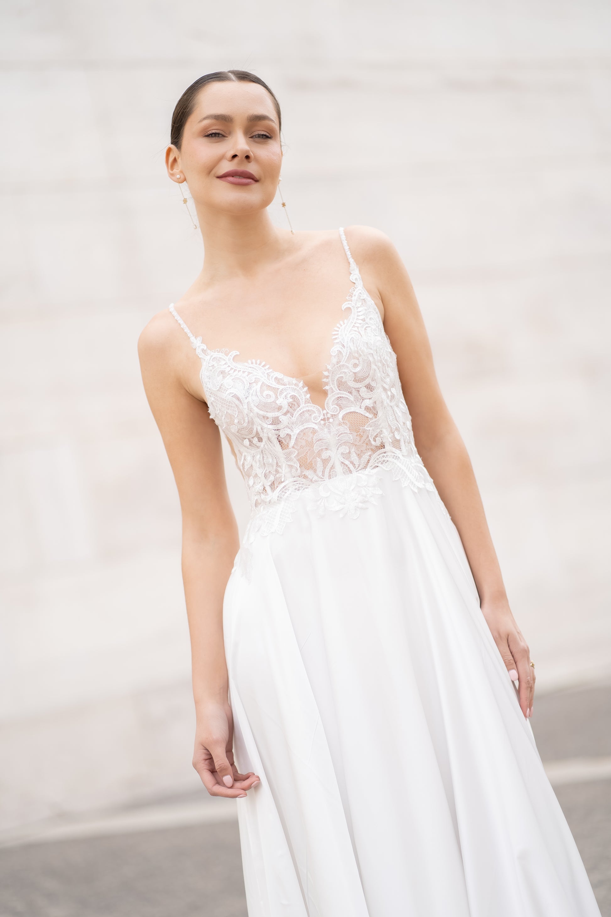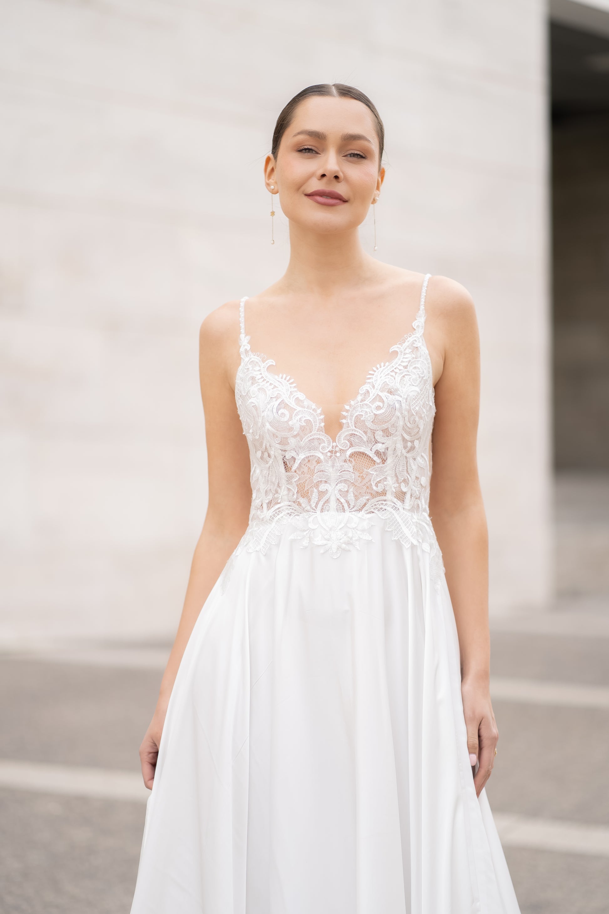 | Vestido faldon corte A, confeccionado en seda maximo de ruedo y camiseta encaje y aplicaciones bordadas, escote delantero tipo V-Neck y laterales Deep plunge, tirantes de pedrería |
