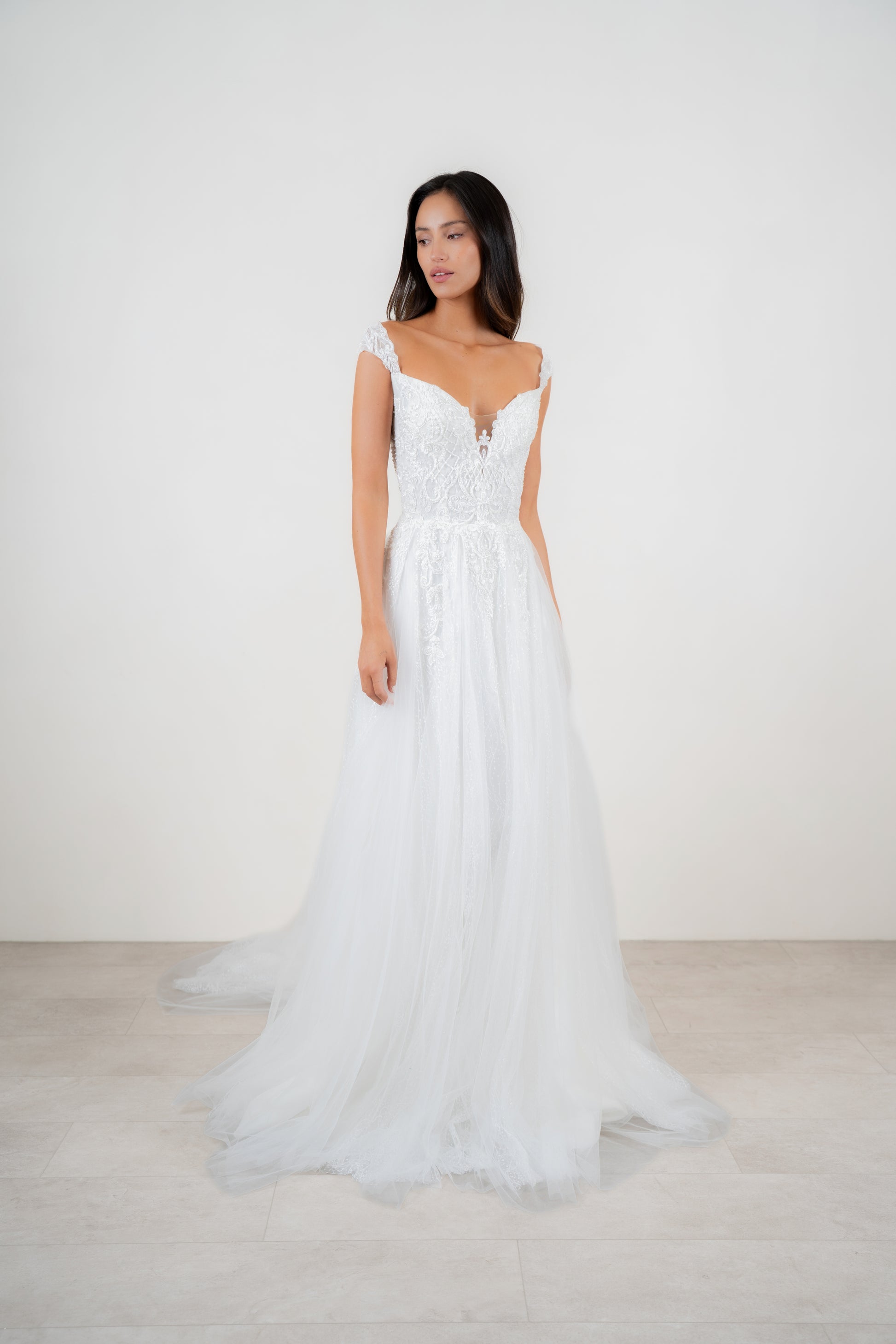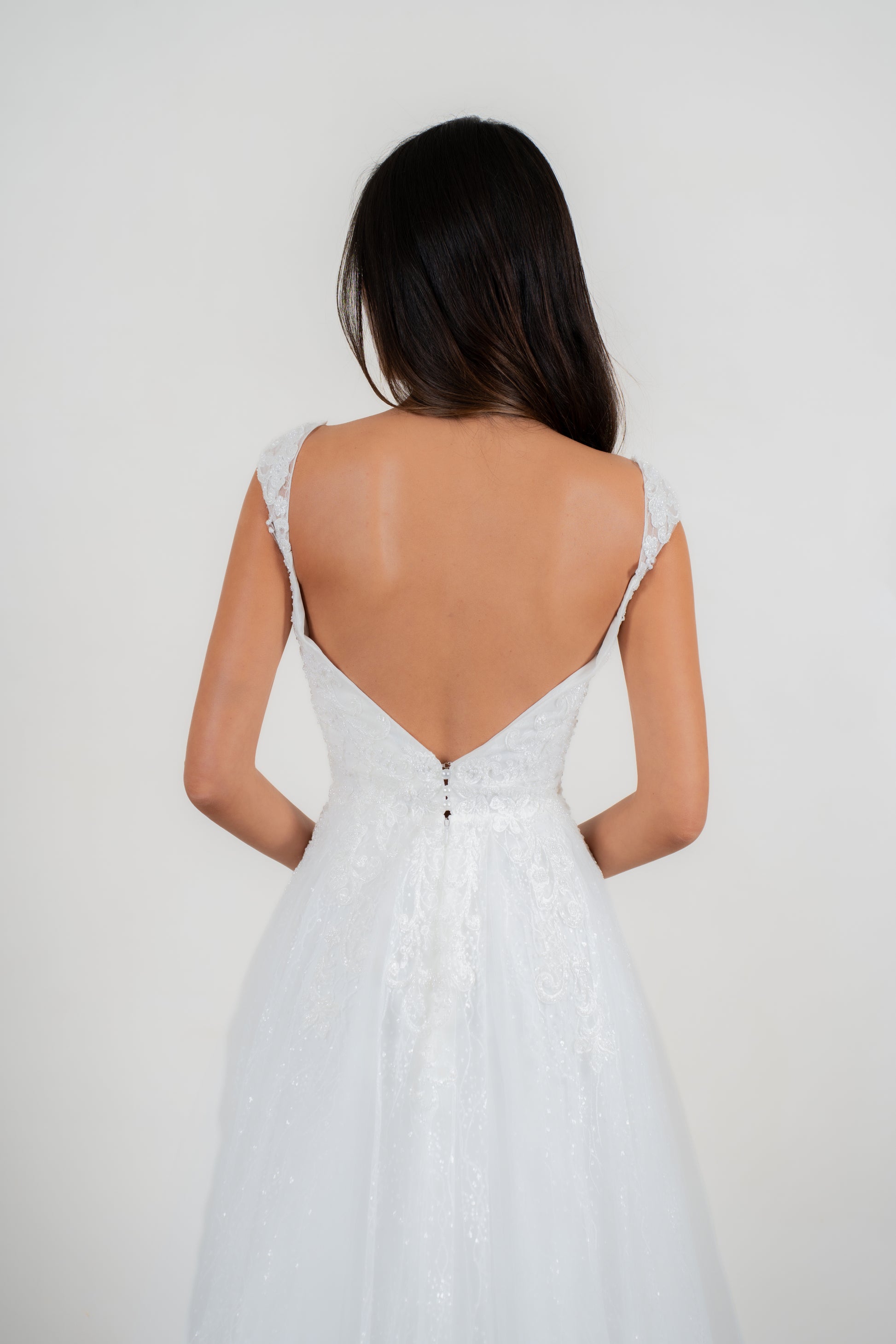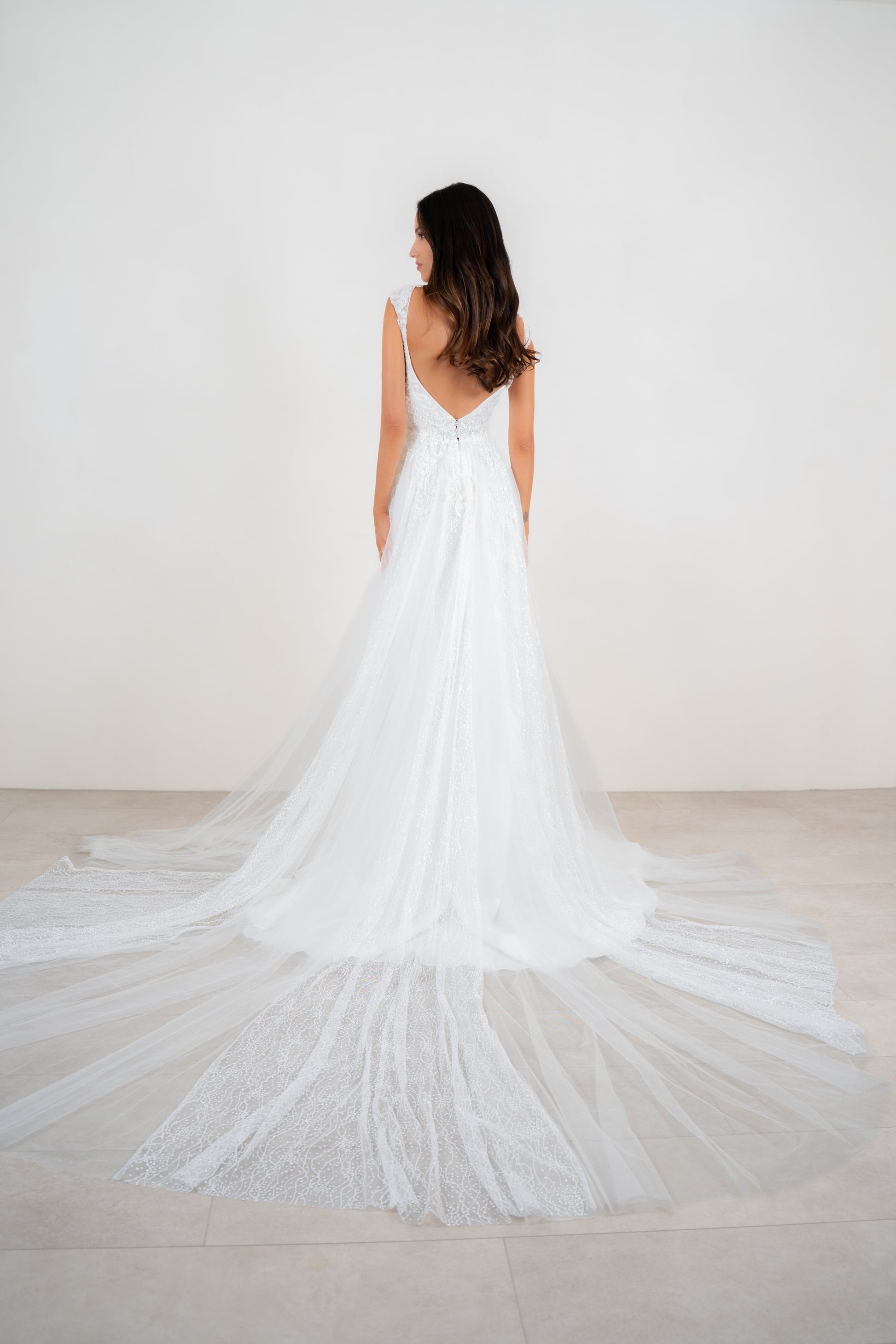 La delicadeza y simplicidad son parte de las características de este vestido que tiene un carácter medieval, impulsado por sus manguitas tipo ojal que dialogan con un escote profundo y romántico. Un cinturón delgado de brillos es el conector perfecto con un faldon de corte A de tull ilusión de doble capa, suave, ligero y delicado.Vestido corte princesa, faldón evasé, aplicaciones de tull bordado y pedrería, escote pronunciado, espalda en V.