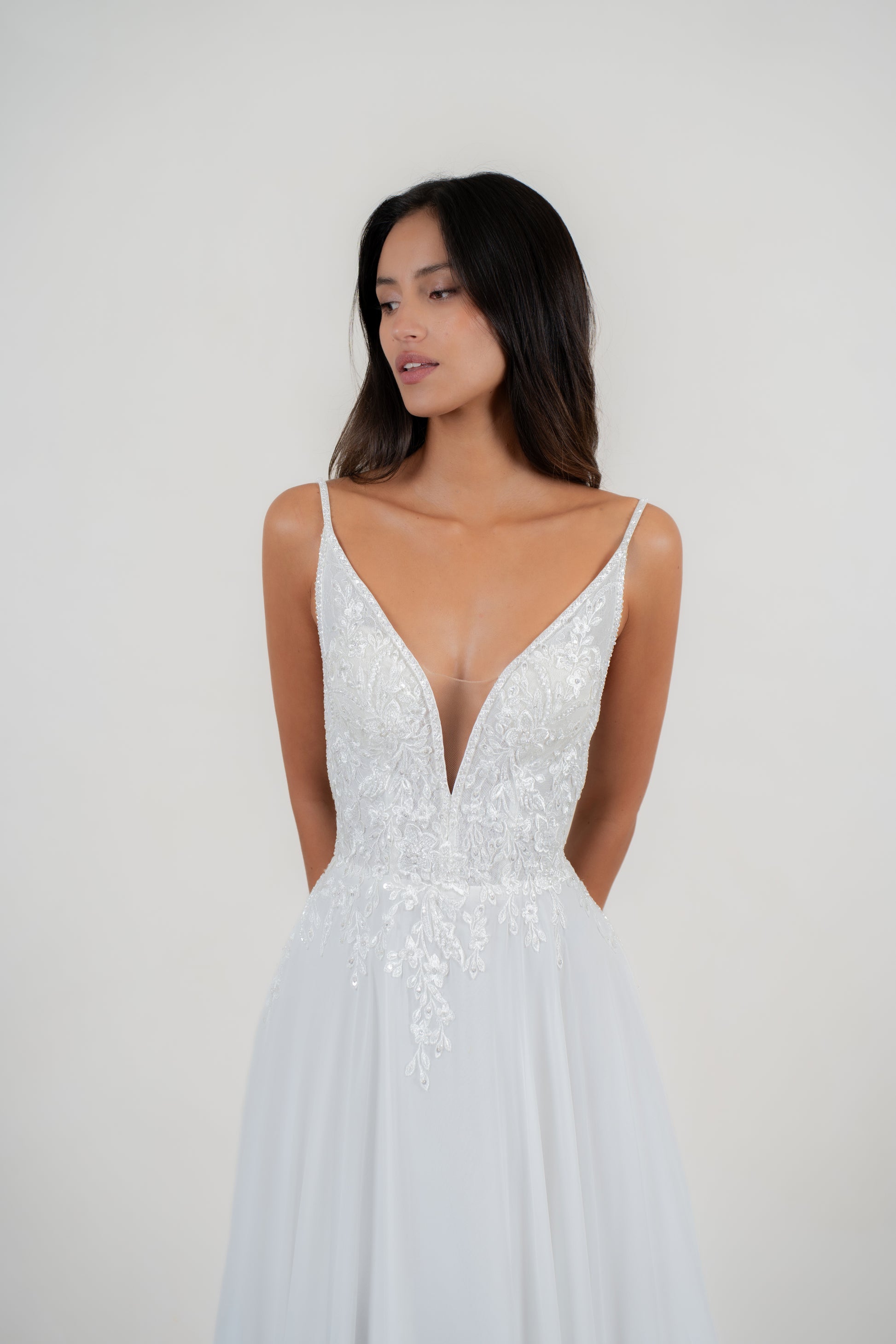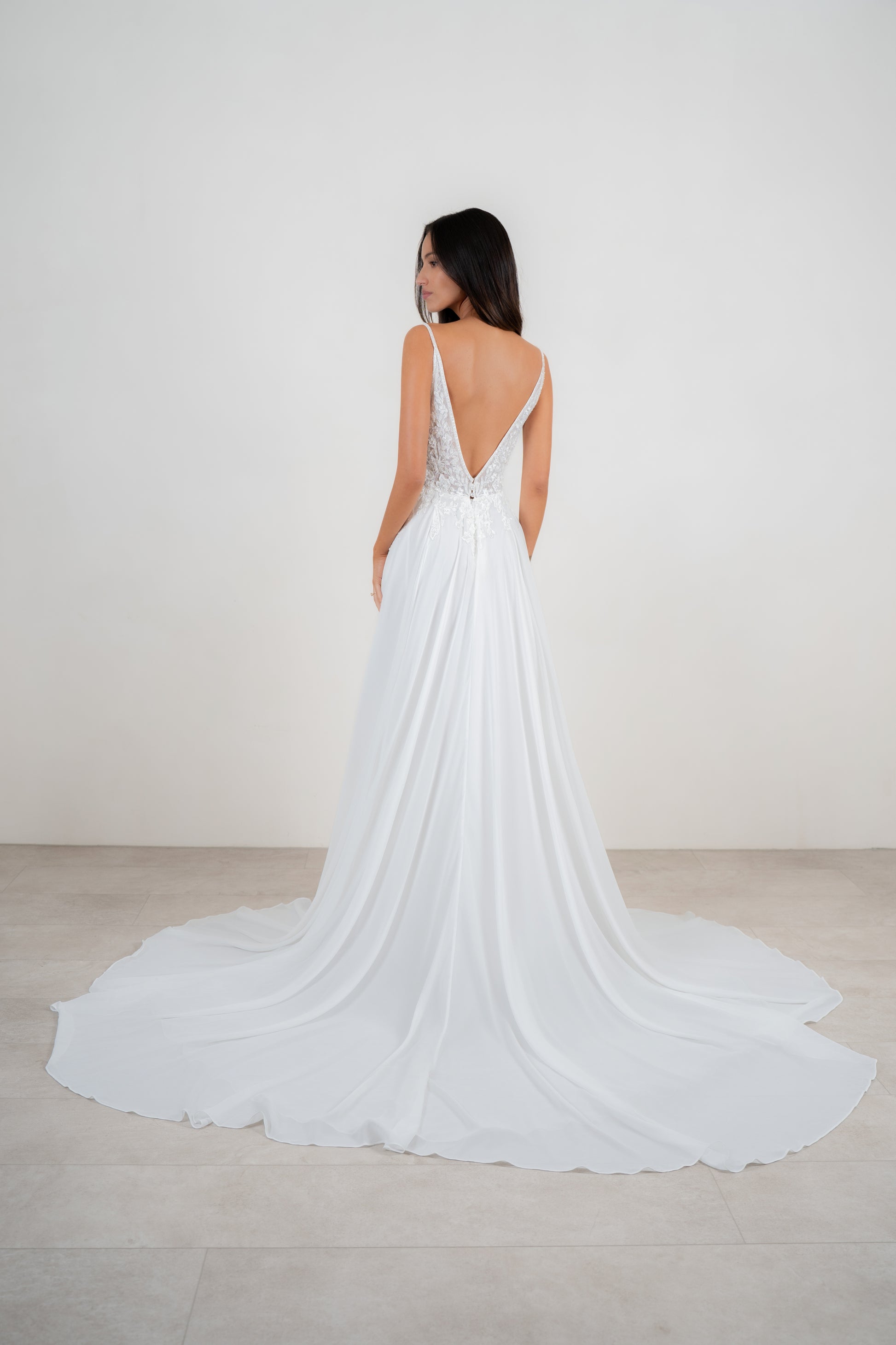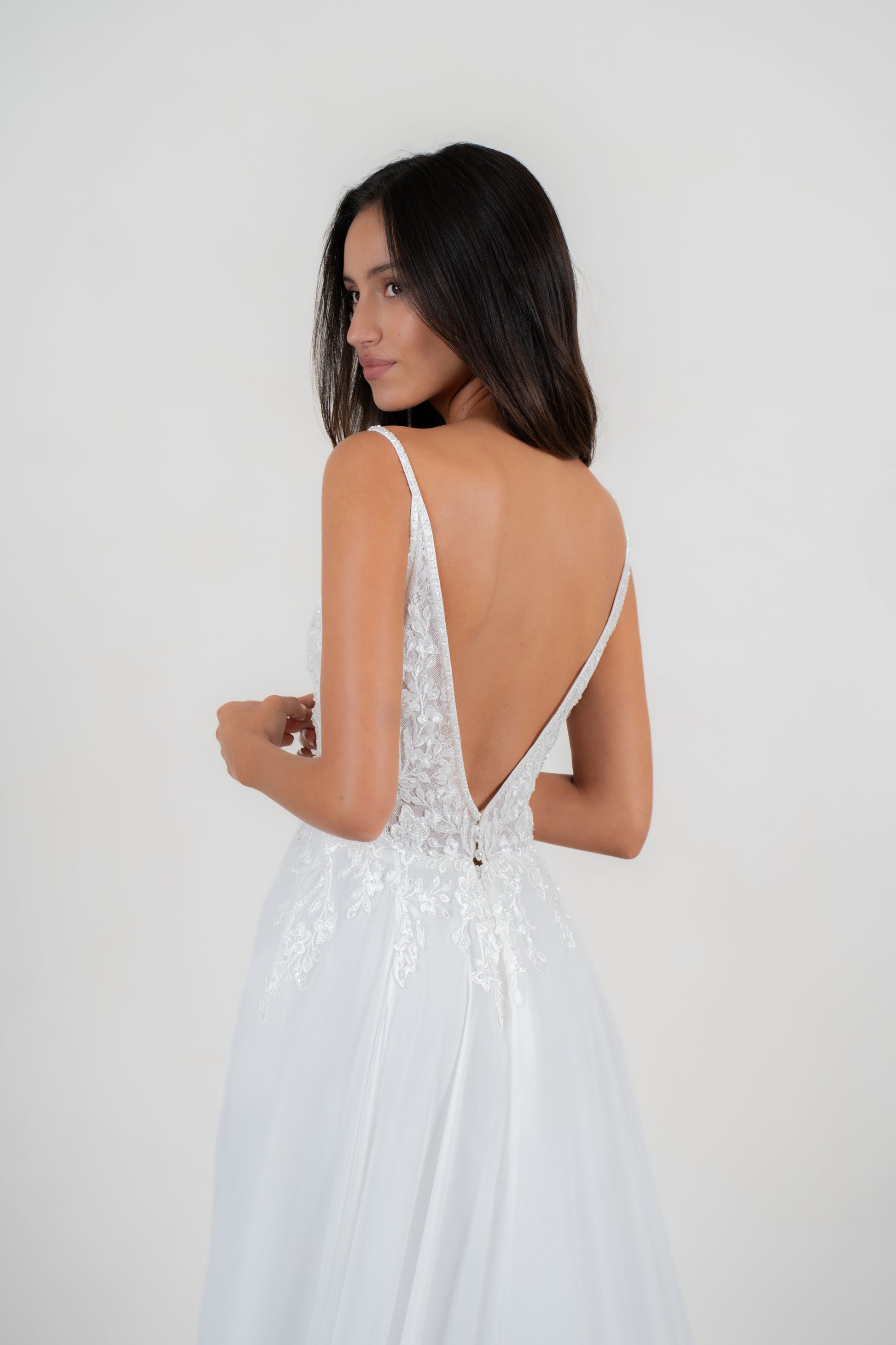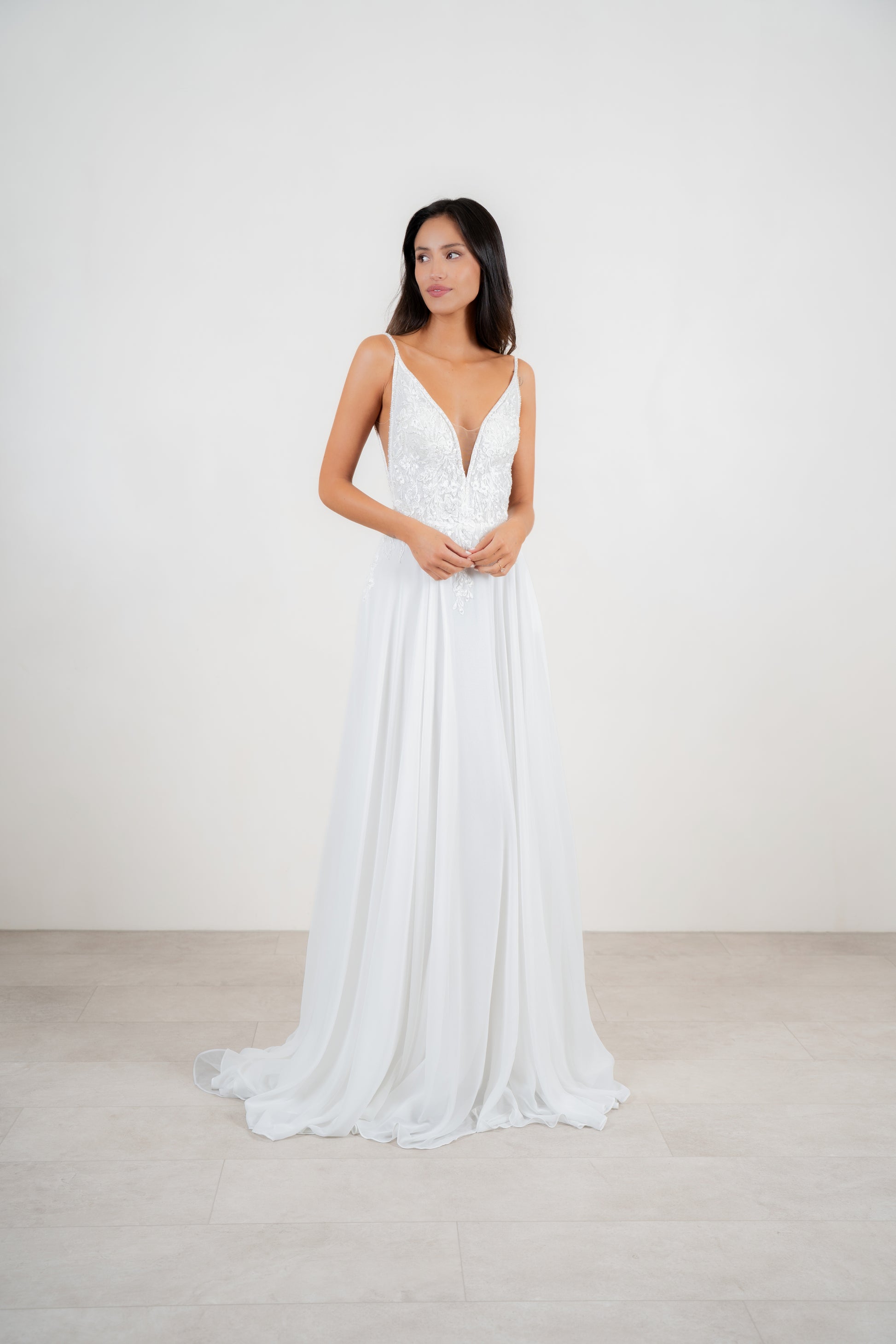 Vestido corte A, confeccionado en gasa crep y microseda en faldon. La camiseta posee un escote deep plunge en delantero y laterales con ribete de seda bordado en predería, finos pabilos bordados. |