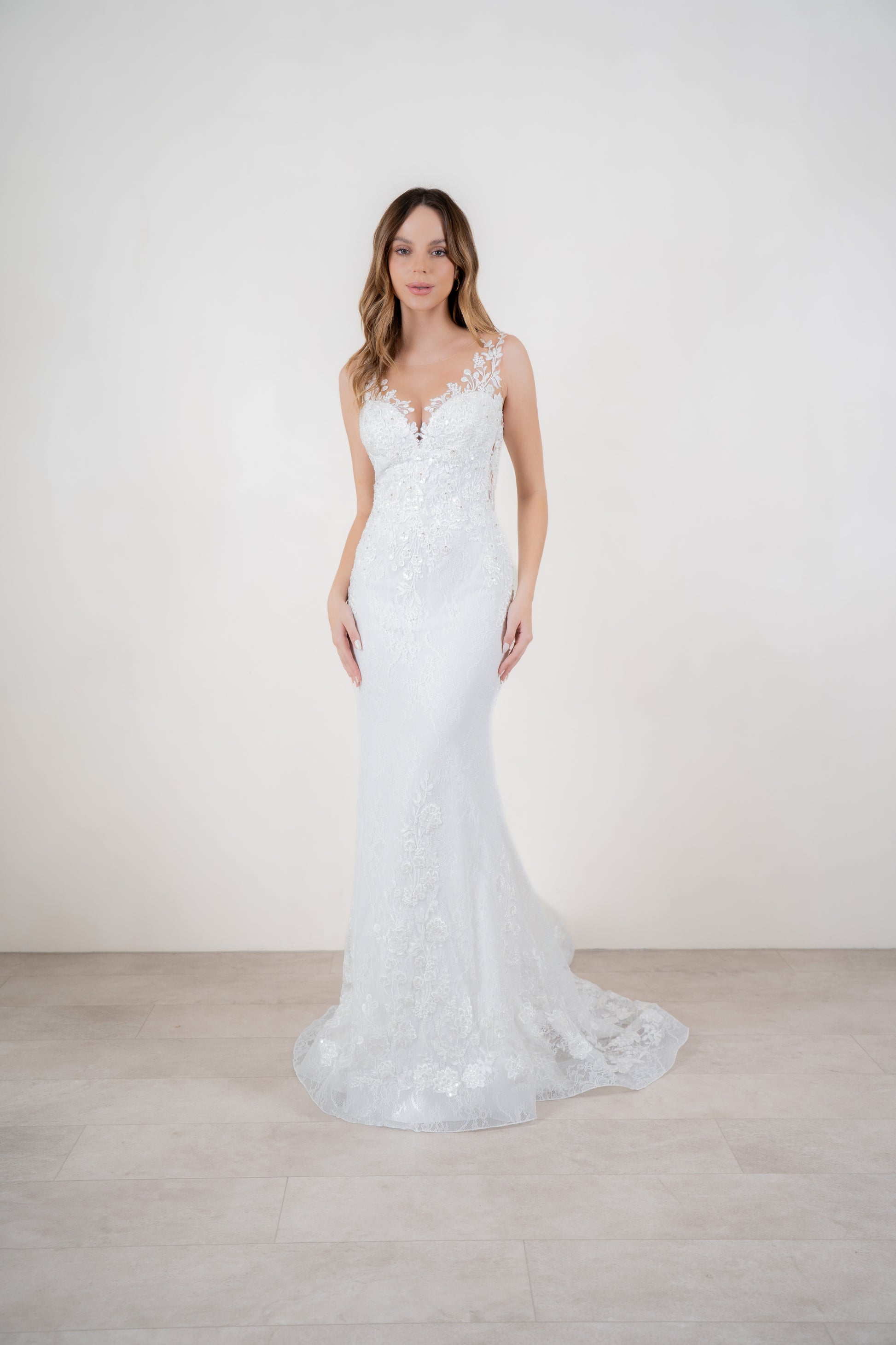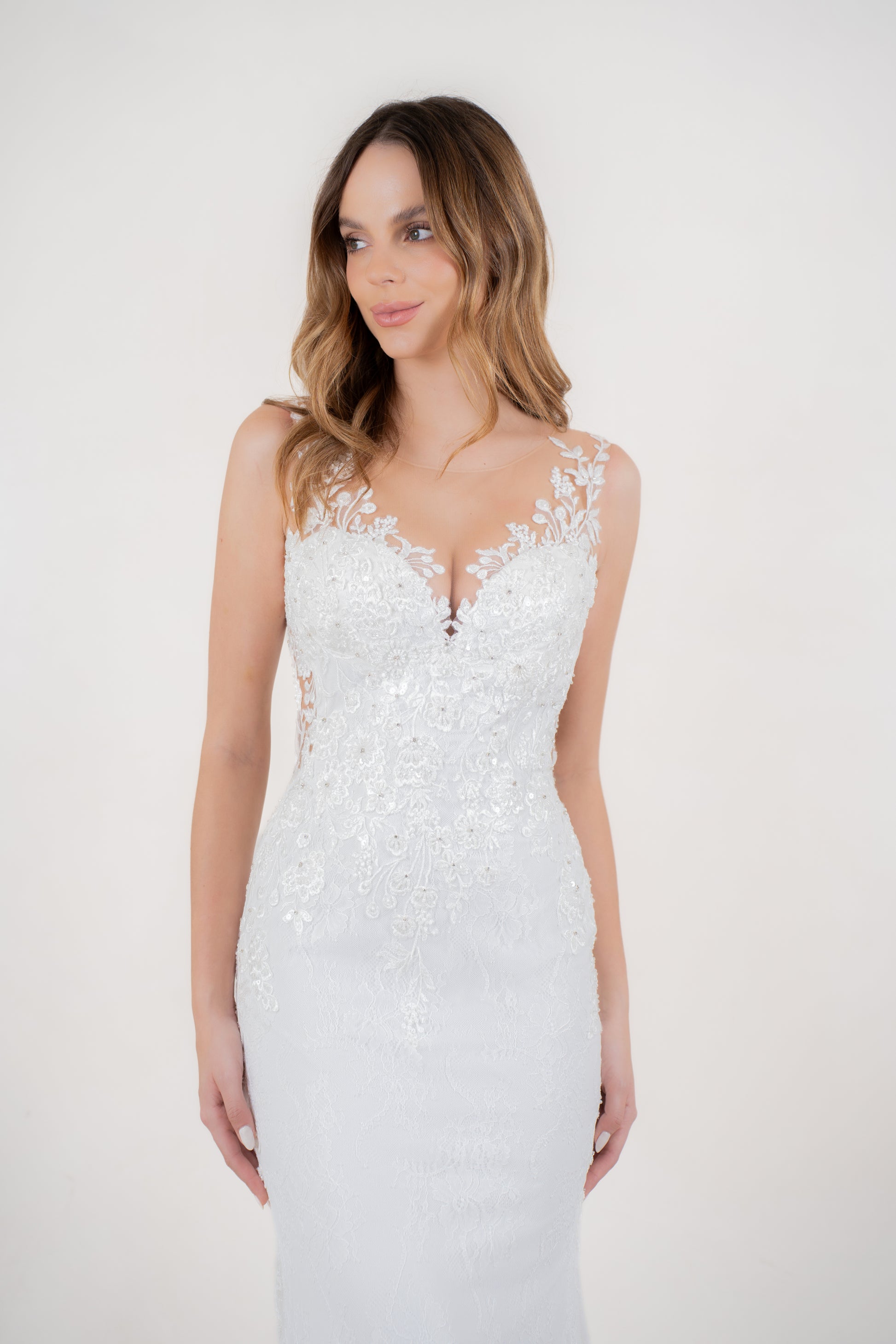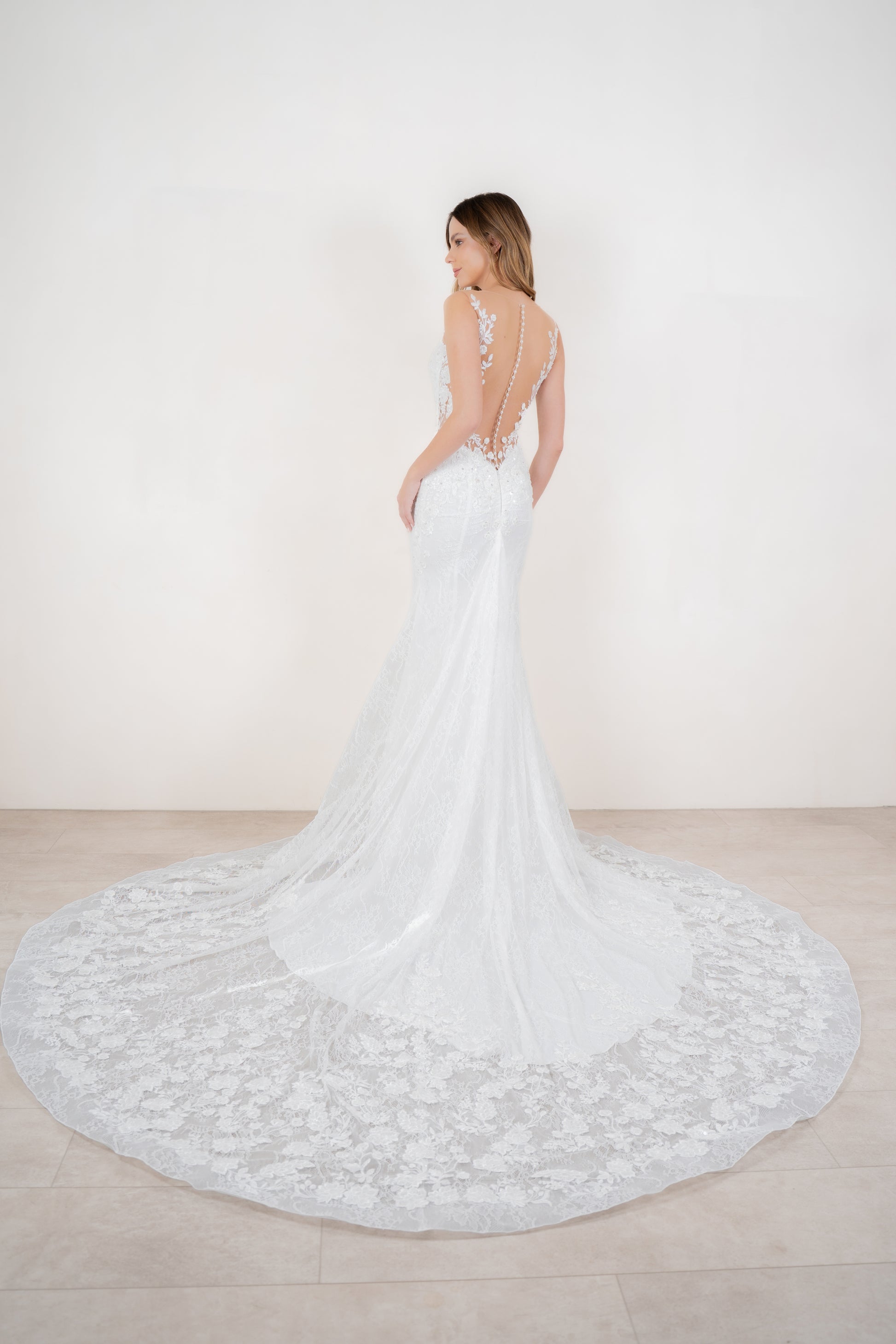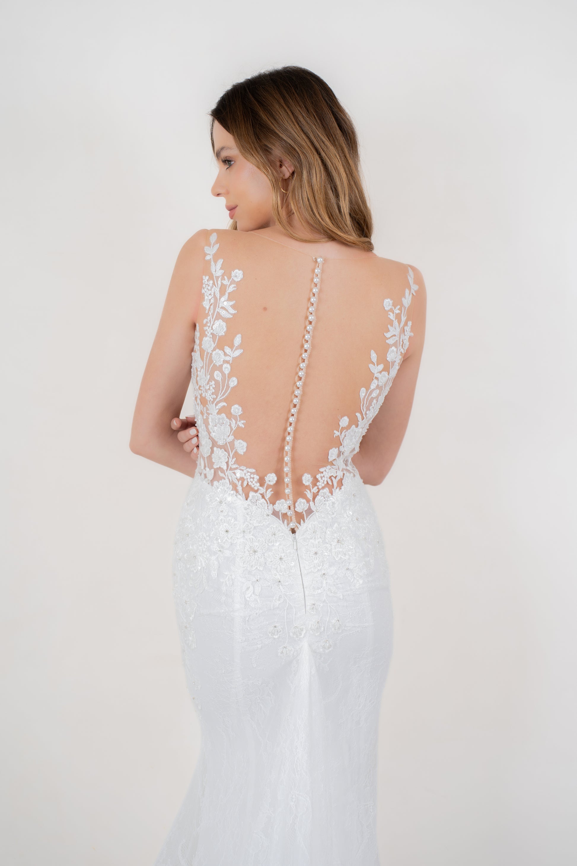 Mravilloso y único, Praga es diseñado para una novia tradicional, pero con tendencias al romanticismo y la sofisticación. Es verdaderamente imposible no dejarse llevar por los encantos de este vestido que como lo dice su colección actúa como una segunda piel, creando una figura que se envuelve en un delicado encaje con toques bordados en color ivory sobre una base de crep nude, realza un perfecto contraste de tintes dorados. La magia continúa con una bella espalda bordada en V, culminando con una extensa cola de encaje estructurada en sus bordes con un ruedo de crin, creado para deslumbrar!