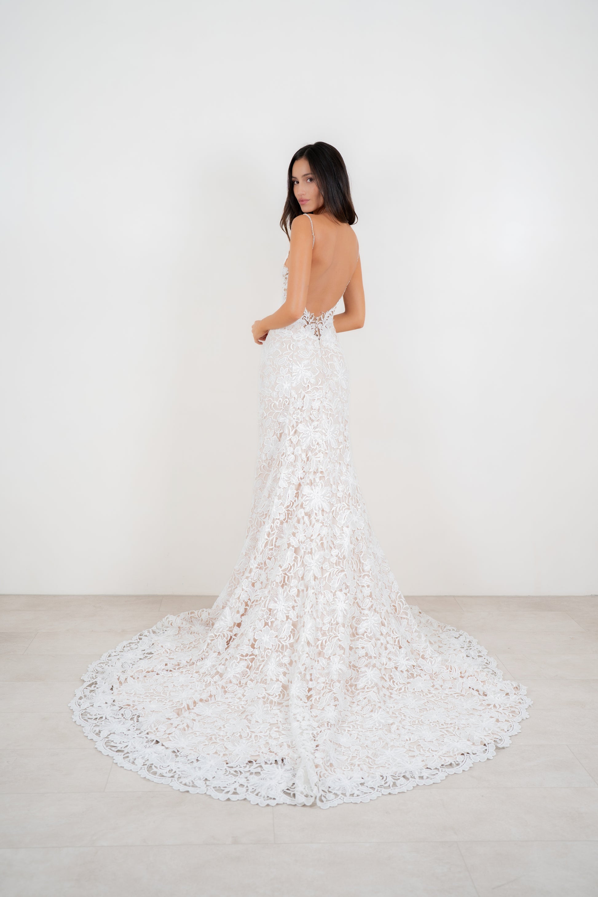 Vestido corte evasé recto, completamente confeccionado en macramé color ivory, sobre un tull malla seda color nudé en la parte del top y un satín semi elasticado color nudé en el faldón, posee una cola de mediano largo y manguitas de macrame desmontables que caen sobre el hombro.