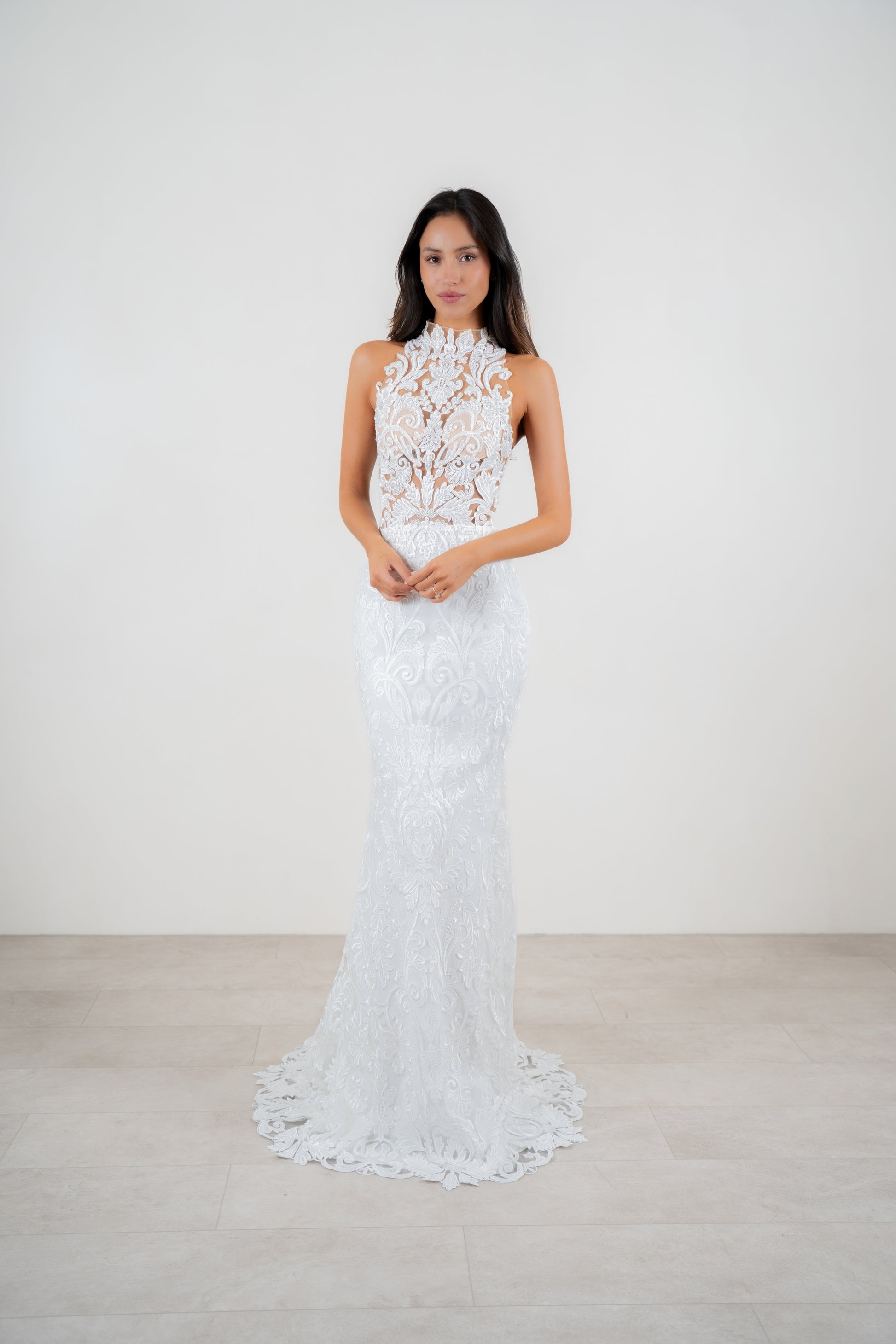 Vestido corte Sirena, completamente confeccionado en macramé color ivory, sobre un tull malla seda color nudé en la parte del top y microseda semi elasticada color nudé en el faldón, posee escote tipo halter y espalda completamente traslucida con botones perlados. |