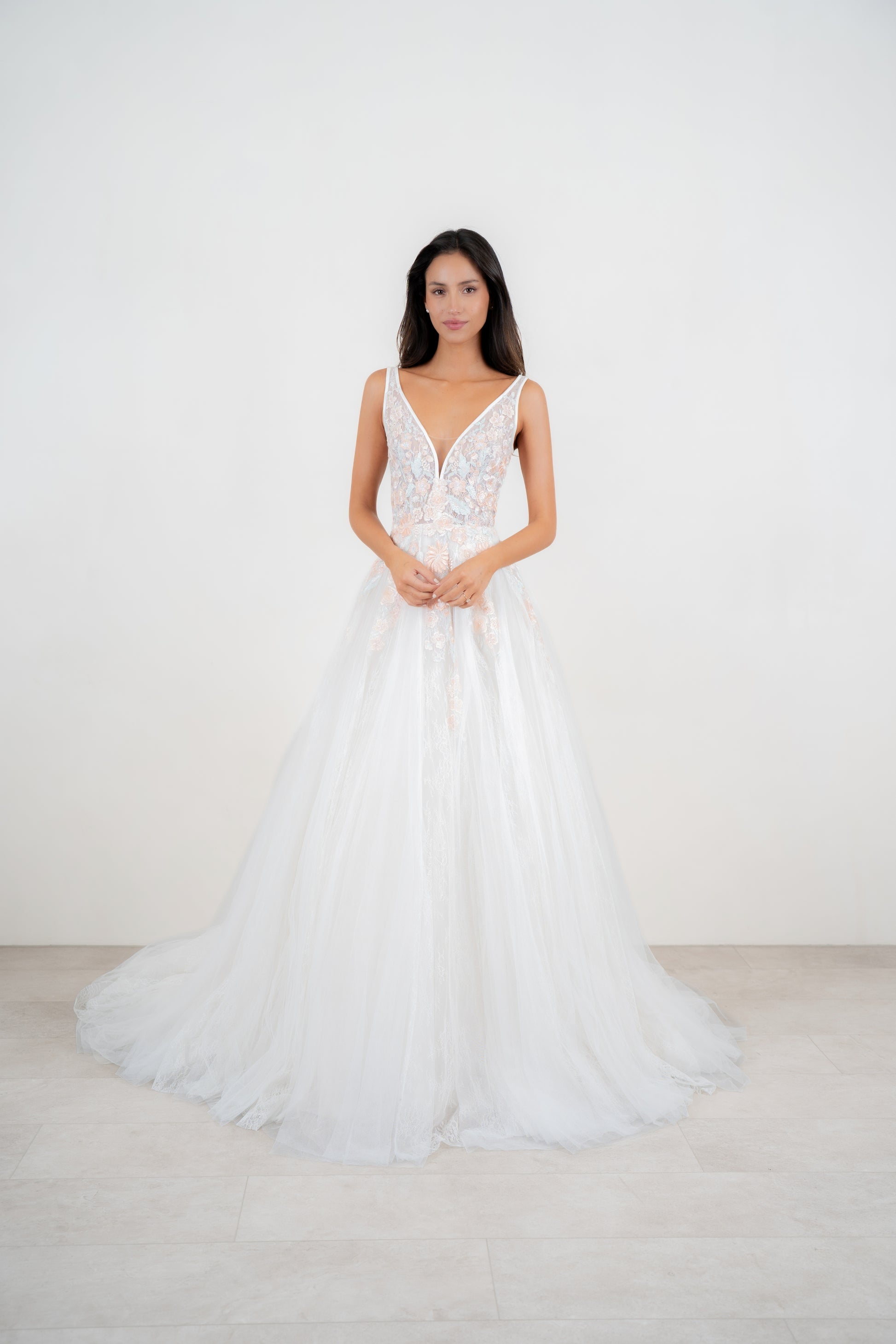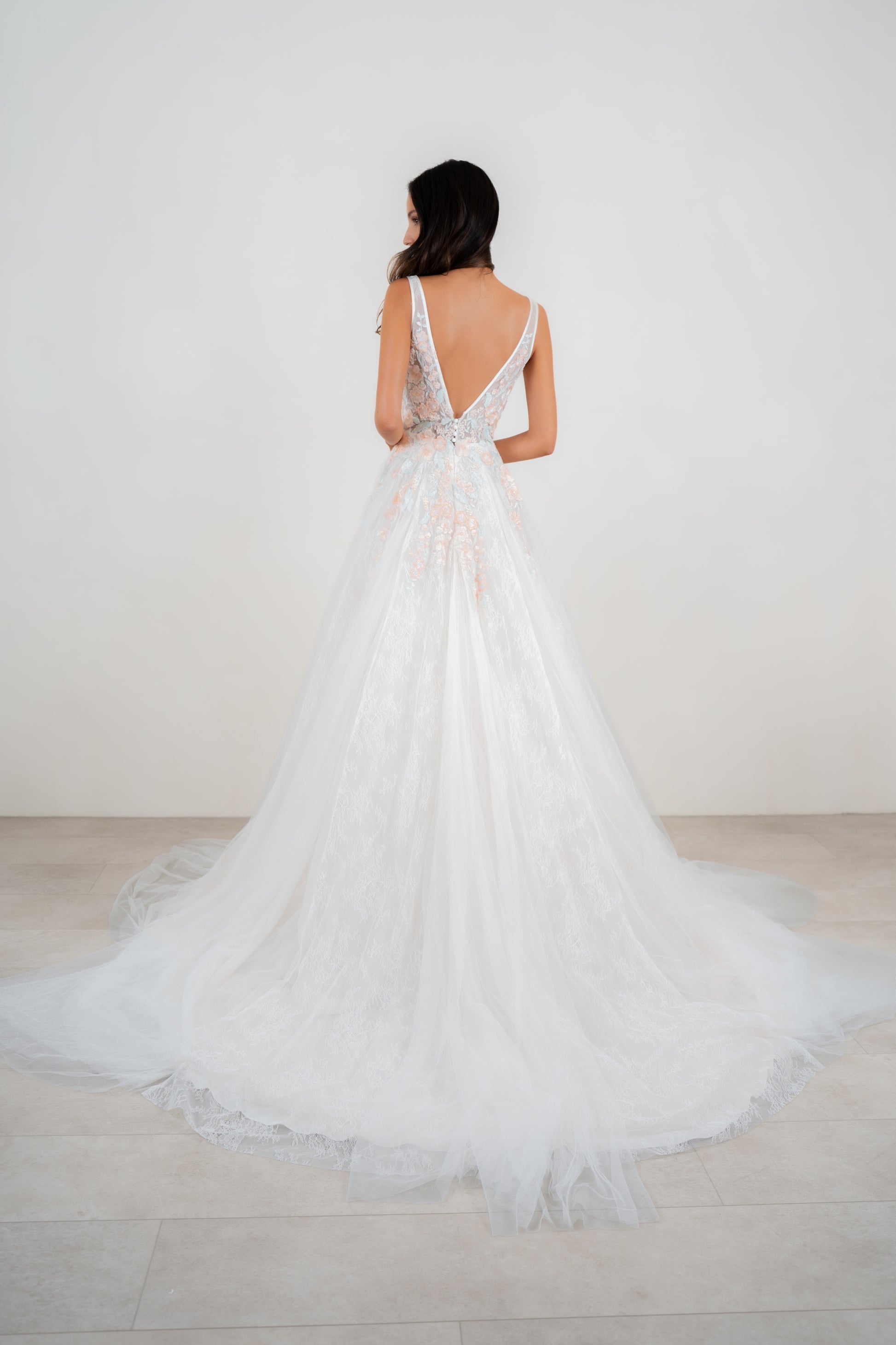 | Vestido corte A de maximo volumen, confeccionado en encaje, tull y aplicaciones bordadas. Ambos escores V-Neck se unen por un ribete de seda que recorre todo la camiseta. Falso de tull incorporado |